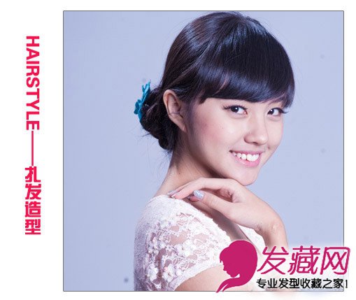 斜刘海修饰脸部线条,展现出完美的五官。长发盘成饱满的花苞头,发饰点缀更显优雅。