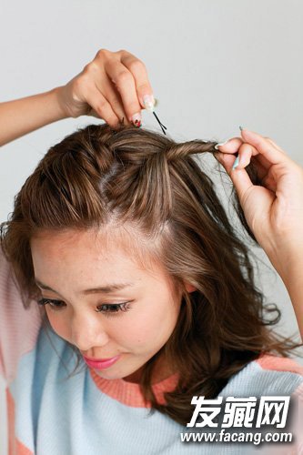 2,将步骤01的左右头发薄薄拉出,往后拧卷并在靠近01发卡的位置弄成小小的蓬巴度型。