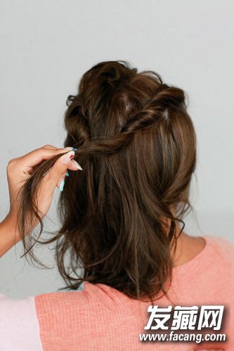 4,将步骤03在左耳后方用发夹固定,把右侧的头发在后颈发际线拧成一束后用发卡固定。