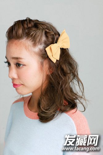 侧面效果图 搭配亮眼的发饰,这款发型更吸睛了,冬日这样的半扎发搭配蝴蝶结给你意想不到的温暖感觉。