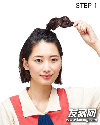 STEP 1:将头顶区头发往侧边一点编成麻花辫(不要在头顶正中编织,这样会显得傻气)。