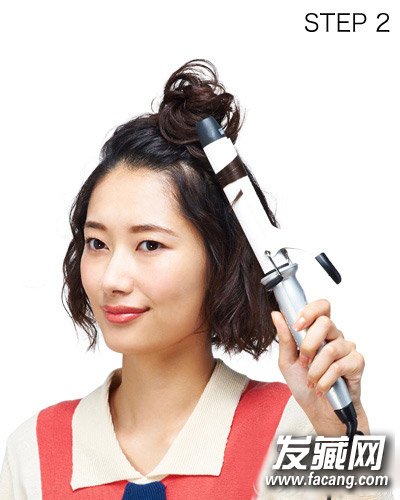 STEP 2:先把麻花辫绕成丸子头,用隐形夹固定即可。然后用直径为28MM的卷发棒电卷两侧头发。