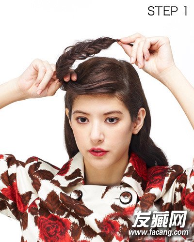 STEP 1:先把头发一九侧分,大片头发编成鱼骨辫或者麻花辫,用橡筋固定后,往小比例那边放。