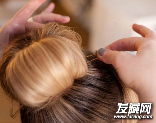 第三步:倒梳完毕后,把马尾辫围绕皮筋盘成圆形,发梢塞入橡皮筋根部,然后用U型发卡固定。