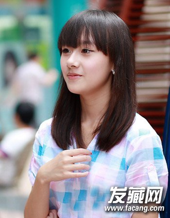 ,发丝柔顺披肩显露出清甜内敛的气质来,发尾裁剪整齐显露出个性与时尚的一面, 加上薄刘海气质有加。