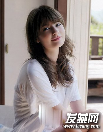 时尚的中长卷发发型,中分平刘海显露出个性与时尚的一面来, 卷发的设计也显得颇有时尚感,加上闷青色的发色点缀清新淡雅。