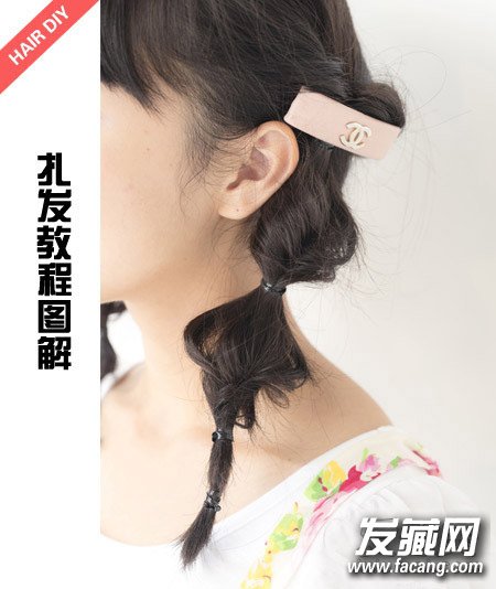 发辫用一次性发带打造出纹理丰富的马尾效果,发饰的修饰下甜美感尽显。