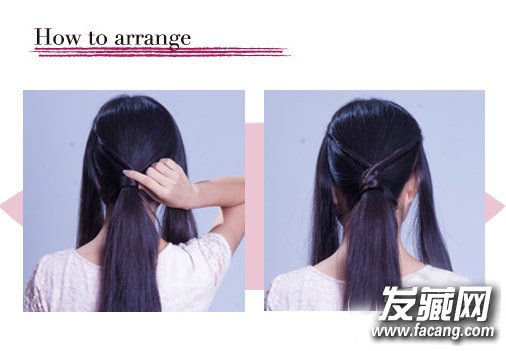 step3:从左侧取出一束头发扭转成发辫后缠绕在马尾上。