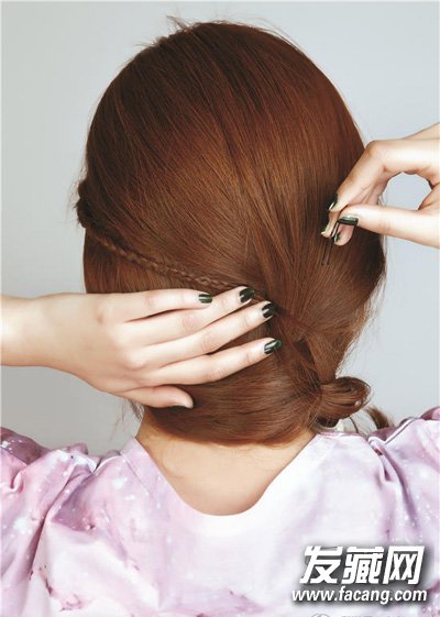 step5:将之前编好的刘海造型发辫,拿到后面用钢夹以发辫纹理为准进行固定,并且将剩余发尾隐藏到发辫纹路中,达到最自然效果!