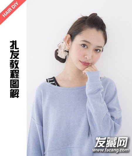 前额的刘海扭转成发辫后固定起来,露出光洁的额头,侧边花苞头甜美清爽。