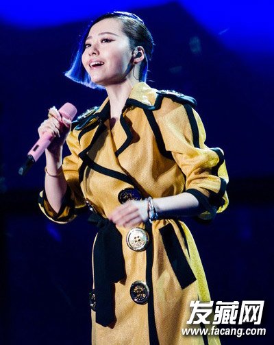 这个发型是张靓颖非常难得一见的突破式发型,紫色的大片式染发增加发型的立体感和设计感,