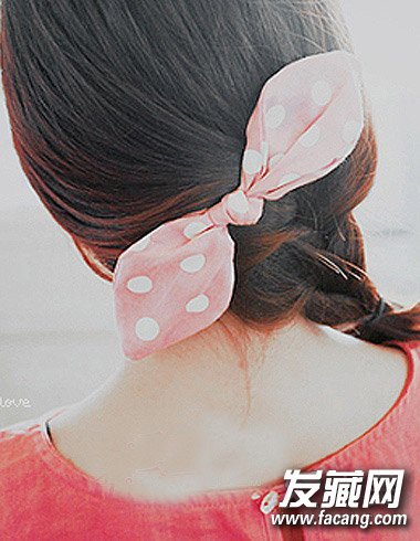 中长发女生的编发造型,上一款凸显小清新精致味道,这一款简单将头发编成麻花辫效果的编发造型,凸显大方居家女神形象。将头发整齐向后梳,在脑后侧向编出简短麻花辫,用波点蝴蝶夹做麻花装饰,粉色凸显优雅公主风。