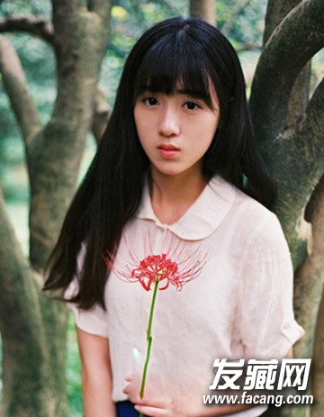 ,圆弧形的刘海裁剪加上厚重的黑色长发,无辜的眼神更为造型增加了一丝别致的气质。