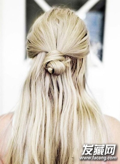 半马尾的升级版本,先将头法分成上下两部分,再将上方头发扎成包子状十分简单又别致的造型,在等电梯时绝对不会有人质疑你的发型!