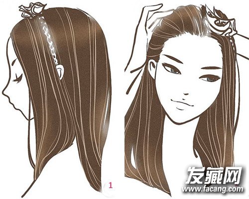 将耳前的头发三七侧分,然后沿着分缝让头发向后盖过发箍。