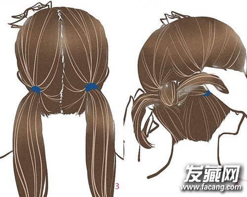 耳后头发中分,分别在耳后靠下部位扎马尾,两个辫子保持水平。