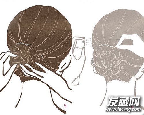 为了使整体造型自然,建议将盘好的发髻轻轻向外拉扯,也让发髻更加饱满蓬松,最后喷上定型喷雾。