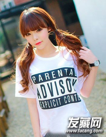 双马尾辫的扎发发型一向都很爱校园小女生的喜爱,而配合亮丽温暖的棕橘色染发,再与厚重的齐刘海和微显蓬松感的烫发造型相搭,更加凸显小女生的甜美俏皮风。