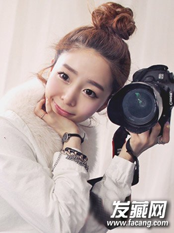有些女生比较娇小可爱,可是却想拥有高挑的身材,那么怎么打理发型可以更显高呢?这款棕色头发,设计成高耸的丸子头扎发发型,自然显高又清爽,搭配清甜白皙的笑脸,萌甜靓妹最可人。