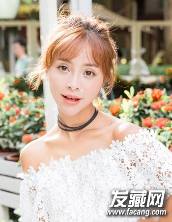 时尚的橘红勾色染发设计可是最显女生肤色的白皙红润感了,而且还能衬托出女生十足的清新淑女风哦,再配合斜刘海形式的简单盘发设计同样清纯吸睛。
