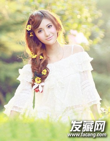 这款可爱吸睛如同花仙子般的侧边扎发发型,十分的美丽动人,棕色长发扎出松散的侧边辫子,个性的刘海设计很有特色。