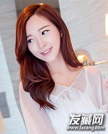 利用的是棕红色的染发颜色来增添女生的清新优雅风,而配合这种偏分形式的无刘海造型设计与侧边微显蓬松的烫发更添十足温柔淑女范儿。