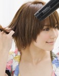 一手将发梢向外卷,另一手拿吹风机将发梢向外吹,使发梢稍稍改变方向。