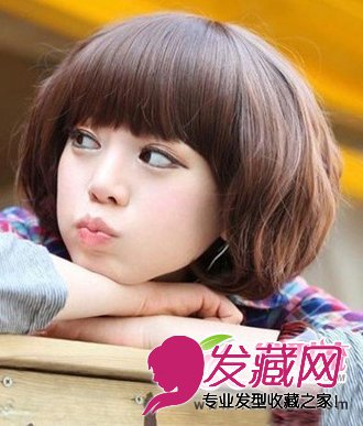 将短发发型打造出卷曲效果弧度,带有着小女人味道,厚重感的刘海发型又打造出了女生小可爱俏皮的气质,两侧蓬松的卷发发丝,几乎将女生的整个脸颊包裹了起来,塑造出了一张精致的小脸,一双大大的眼睛,显得十分的精灵可人。
