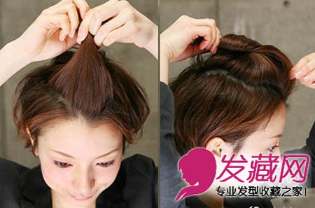 把短发刘海梳高,往后面侧扭,尽量让额头的刘海立起来,有高度。