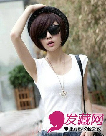 圆润可爱的波波头短发干练时尚,内扣的发丝造型修剪很精致个性,深色的染发很有韩流气息,再加上一顶帽子更有独特的韵味。
