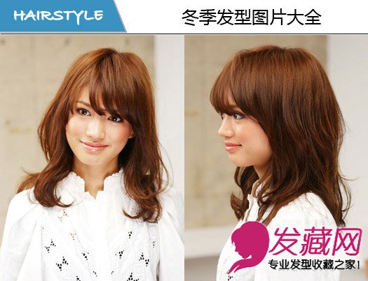 发型点评:咖啡色长卷发妩媚甜美,长长的空气刘海别致个性,为完美气质加分不少。