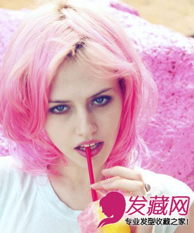 侧分的刘海慵懒的搭在眉尾部分,卷烫后的头发更加立体,粉色发色透露着青春的活力。