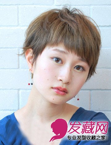 精灵般的弧度,碎发的短俏刘海遮住额头若隐若现的显露眉毛,学生头吹出蓬松效果更好看,配上耳饰不失可爱女人味。