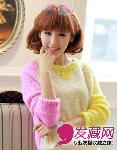 ,蓬松的刘海与梨花烫发形成别致的时尚感,糖果色的毛衣与棕色的发色形成映衬,甜美十足,特别有青春靓丽的气质。