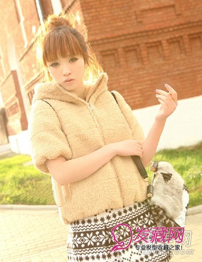 可爱少女风格的丸子头,齐刘海、金棕色的头发,头顶绑上一个小巧发髻,即阳光靓丽又活泼青春的小女生气质。