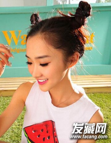 可爱的俏皮双丸子头扎发发型,有点像羊角辫的感觉哦,不仅时尚而且颇有个性感,整个造型的设计打造出别致的时尚感来,清爽的露额发型颇为时尚 。