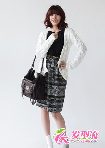 白色的毛衣开衫搭配民族感的图案中裙就不会显得整体混乱,而且也让老气感消失。