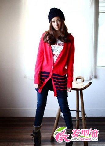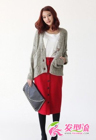 白色的简单TEE搭配灰色针织衫给人慵懒感觉,宽松的剪裁相当舒适,搭配一条红色长裙,既醒目又优雅。