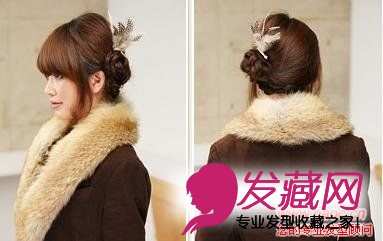 发型诠释:斜刘海的处理,非常知性随意,再加上顺着脸颊而下的两束发丝,把无限的女人味一直延伸到下巴。把脑后的长发分成两半,并编成麻花辫,然后把两条辫子扭曲成一个发髻并用发夹固定,由辫子绕成的发髻更具变化性,也带出了知性婉约的气质。