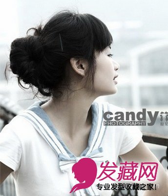 黑色的原发色,制造出女孩青春的学员风格,形状饱满的发髻在脑后,具有厚重感,两鬓和颈部微毛躁细碎的发丝,修饰脖子的形状,非常青春有活力。