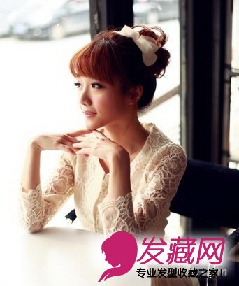 甜美的女生打造起女生发髻来,更增加了女孩的甜美度,在脑后扎一个圆圆的发髻,细碎的发丝散出发髻的效果,很有特色,戴上白色的发带,甜美清纯无限。