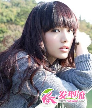 清新长卷发 平刘海,很好地修饰了稍长的脸型,瞬间瘦脸,也把MM的甜美可爱完全展现出来。搭配好看的长卷发,更显小脸效果。淡淡的酒红色发色,在阳光下更显耀眼迷人。立马呈现清新可人的邻家女孩形象,令人倾心。