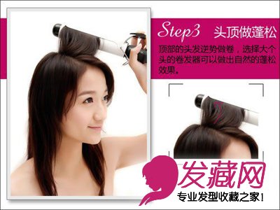 顶部的头发逆势做卷,选择大个头的卷发 器可以做出自然的蓬松效果。蓬松的发顶是这个发型的关键。