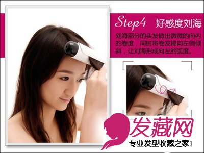 刘海部分的头发做出微微的向内的卷度,卷头发的同时将卷发 棒向左侧倾斜,让刘海形成向左的弧度。