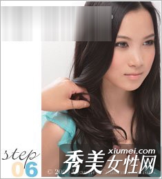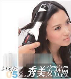 step5. 在左侧黄金分割点分取头路。 为了让刘海 融入脸沿线的发型轮廓, 可以用卷发 棒对刘海发片进行外卷。