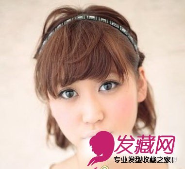 最后一款介绍发饰与短卷发配合打造的女生发型,用发箍把短发往后拨,只留出齐刘海,感觉清新而充满少女气息。发箍下两边的头发需要用发夹固定,使其不会散开,才能保持如此整齐造型。
