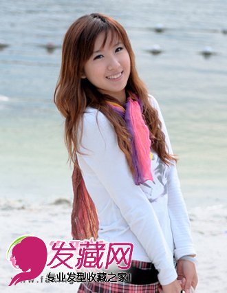 刻意留出的几缕刘海发丝装饰了饱满的额头,起到画龙点睛的效果,亚麻色的染发添加了女孩时尚潮流的感觉,有层次感的微卷发丝充满空气感。这款发型是很适合圆脸卷发MM们的,小编建议留出两边的鬓发用以修饰了圆脸打造小脸的效果。