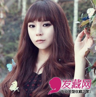 小编点评:齐刘海长卷发发型,相当的减龄,立马让女生变得可爱俏丽,蓬松的长卷发随意的披散下来,能很好的拉长脸型,还散发出性感的优雅气息。