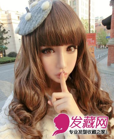 超萌的中长款大卷发,这样的发色很显肤白,超级日系的一款长卷发,齐刘海是显嫩的必备噢