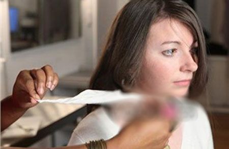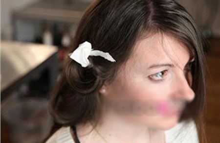Step 3:将定型喷雾喷在纸巾上 (是的,没错,不是喷在你的发卷上!) ,它们能帮助你固定卷发 ,但是不会像定型发卷一样妨碍你或躺或卧,用喷过定型喷雾的纸巾来固定发卷还有一个好处就是,它能将定型喷雾慢慢的释放到你的发卷里去,在你睡着的时候不知不觉的帮你的发卷定型。